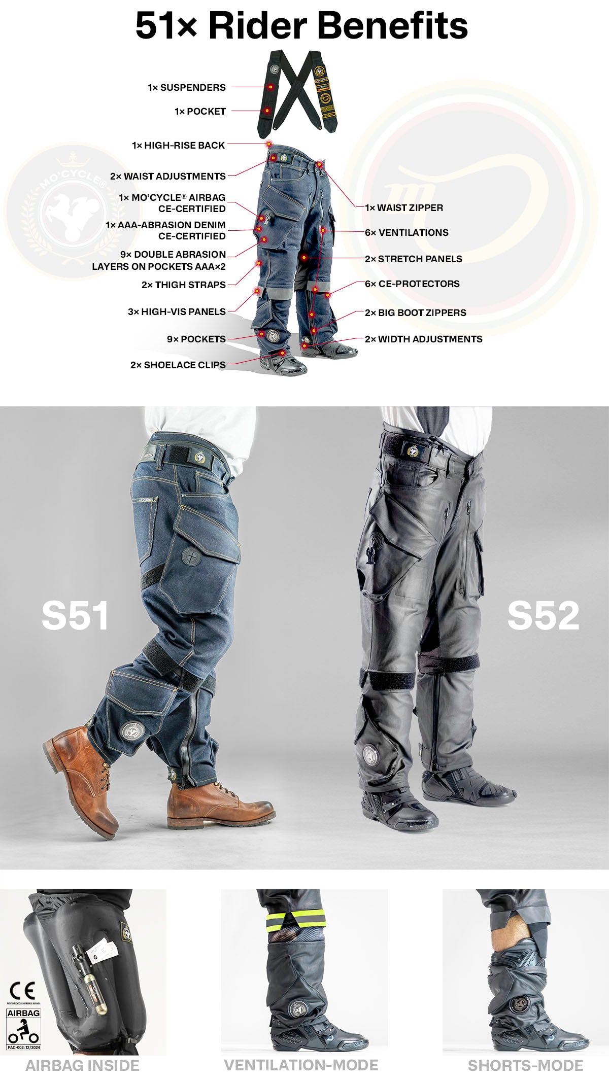 For heat management, the S51/ S52 pants include 6 vents and dedicated Ventilation-Mode and Shorts-Mode for the hottest days, so you can dump heat fast without giving up the airbag protection.