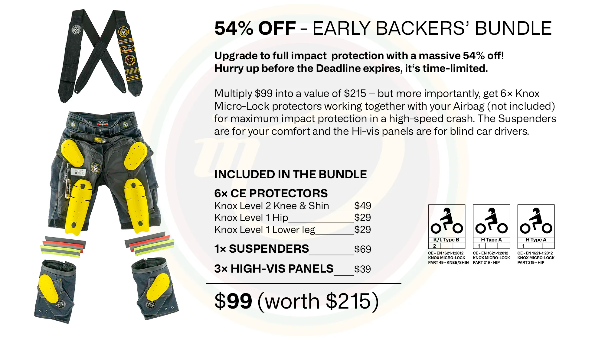 If you already own a Mo’cycle airbag, choose the "Motorcycle Pants" versions and use your existing airbag with it. Add the Protection bundle and get the 6x pads + HiVis panels + Suspender.
