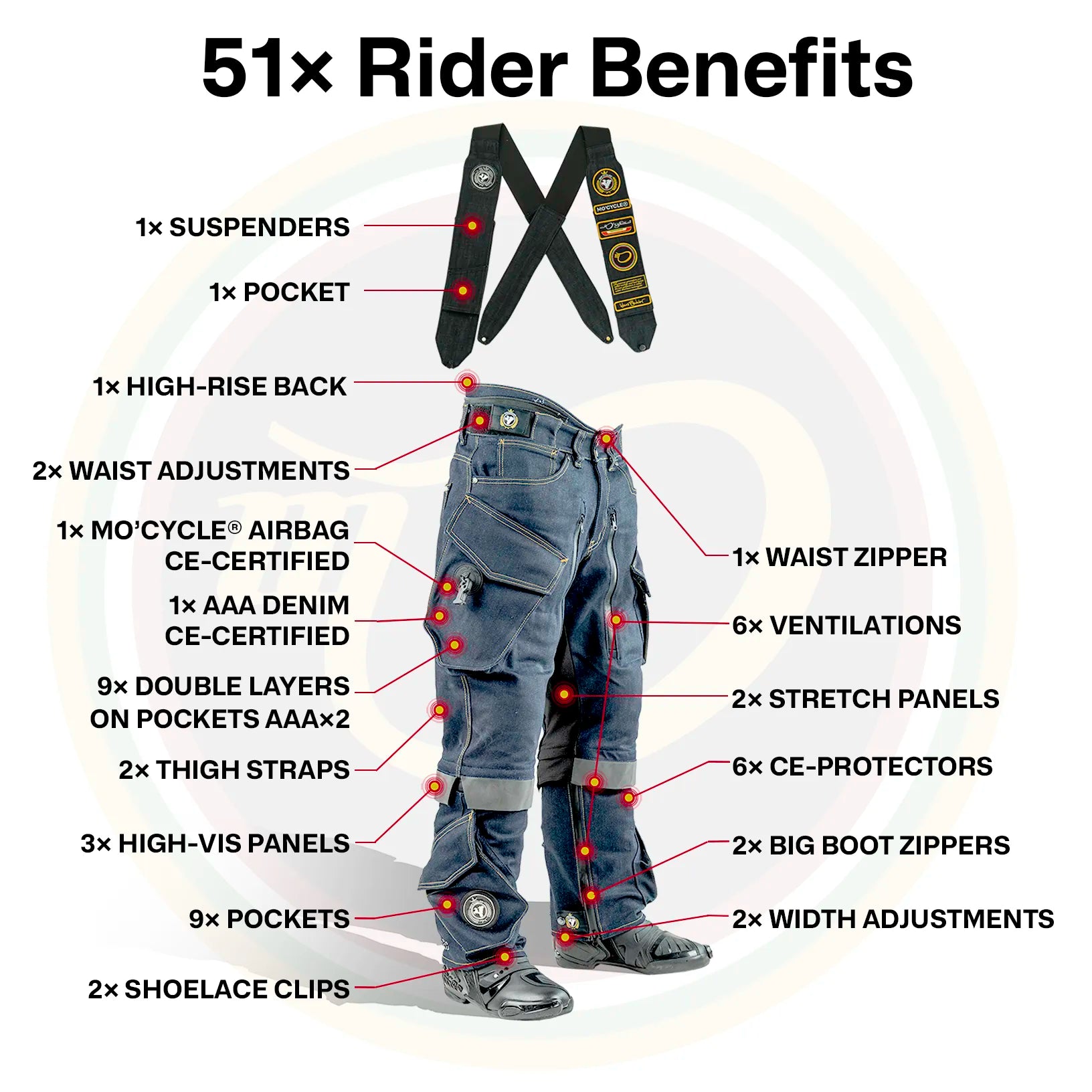 If you already own a Mo’cycle airbag, choose the "Motorcycle Pants" versions and use your existing airbag with it. Add the Protection bundle and get the 6x pads + HiVis panels + Suspender.