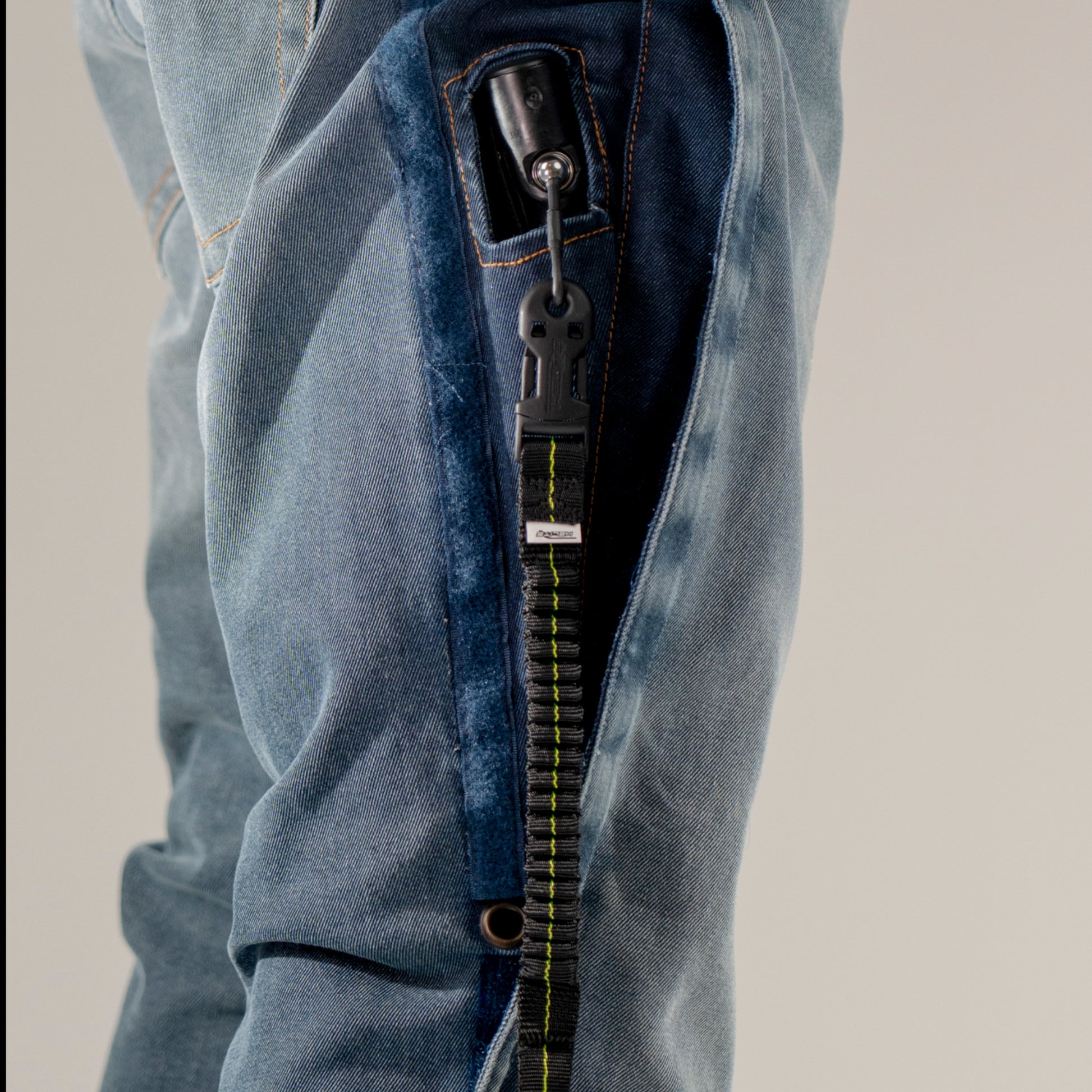 The Airbag Jeans features a unique two-piece system: the jeans and the airbag are separate but can be zipped together. This design allows the jeans to slide over the airbag during an impact, reducing the force through friction and enhancing your protection.