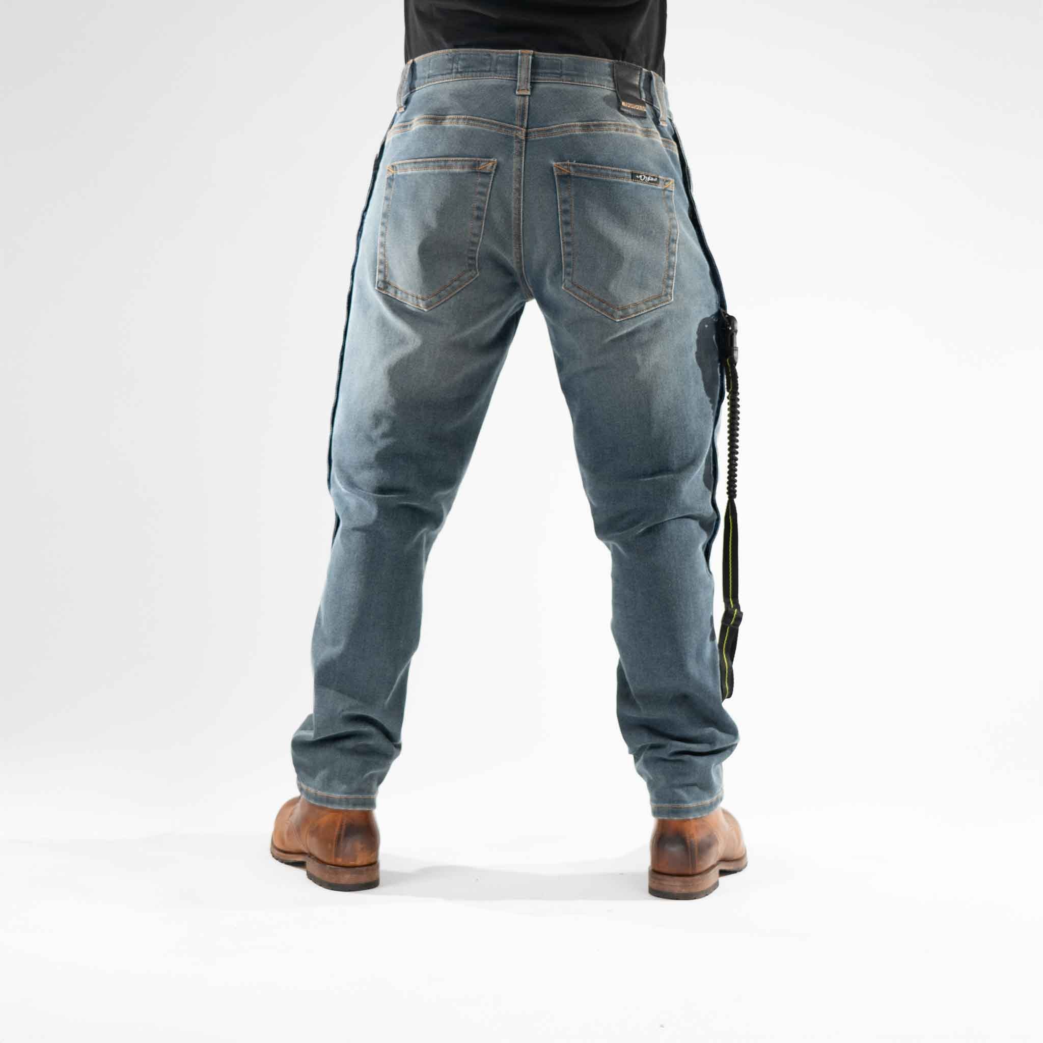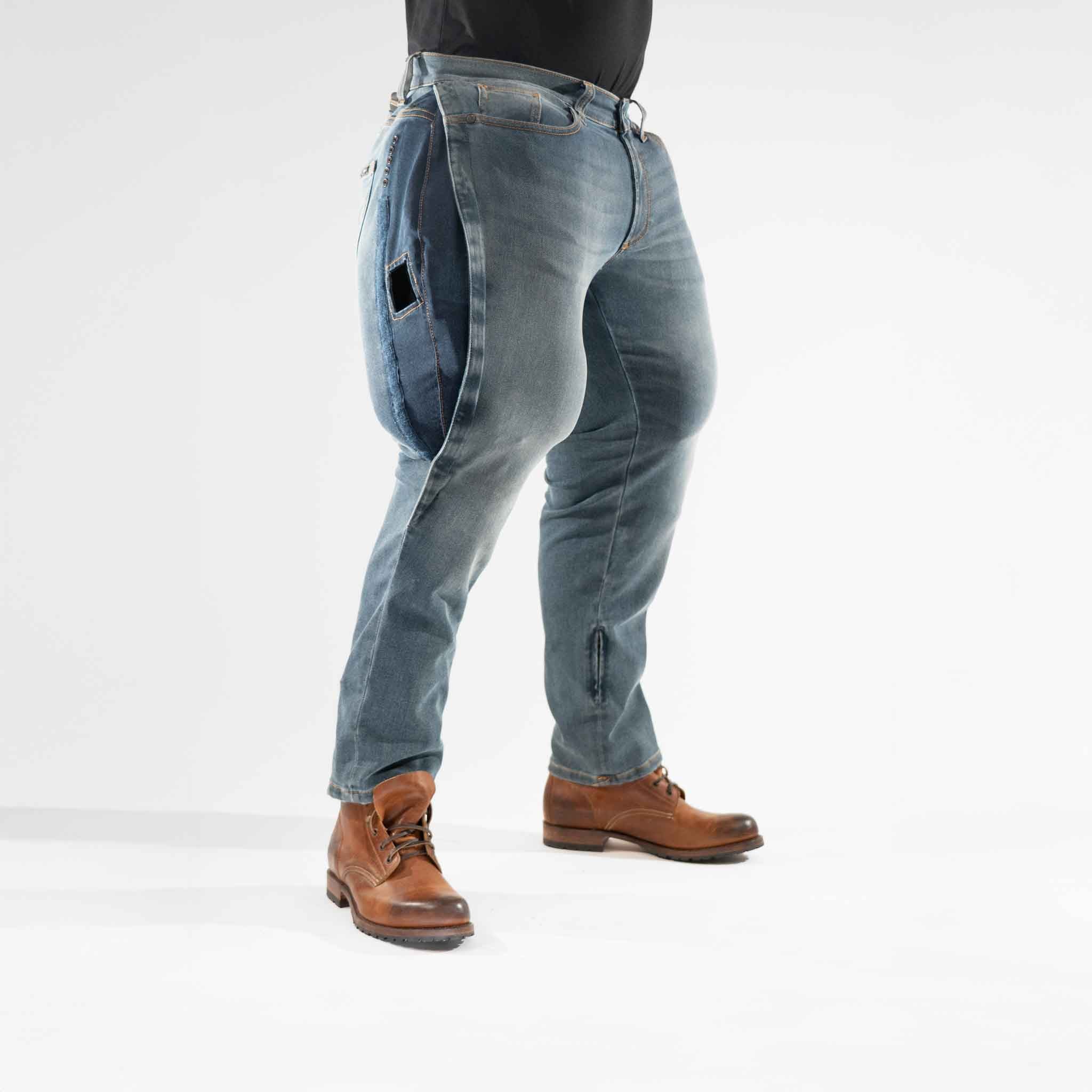 From behind and from the side, Kian just looks like a solid pair of men’s blue jeans. Only you know they are designed to be compatible with a full lower-body airbag system – a stealth safety layer for riders who live in denim.