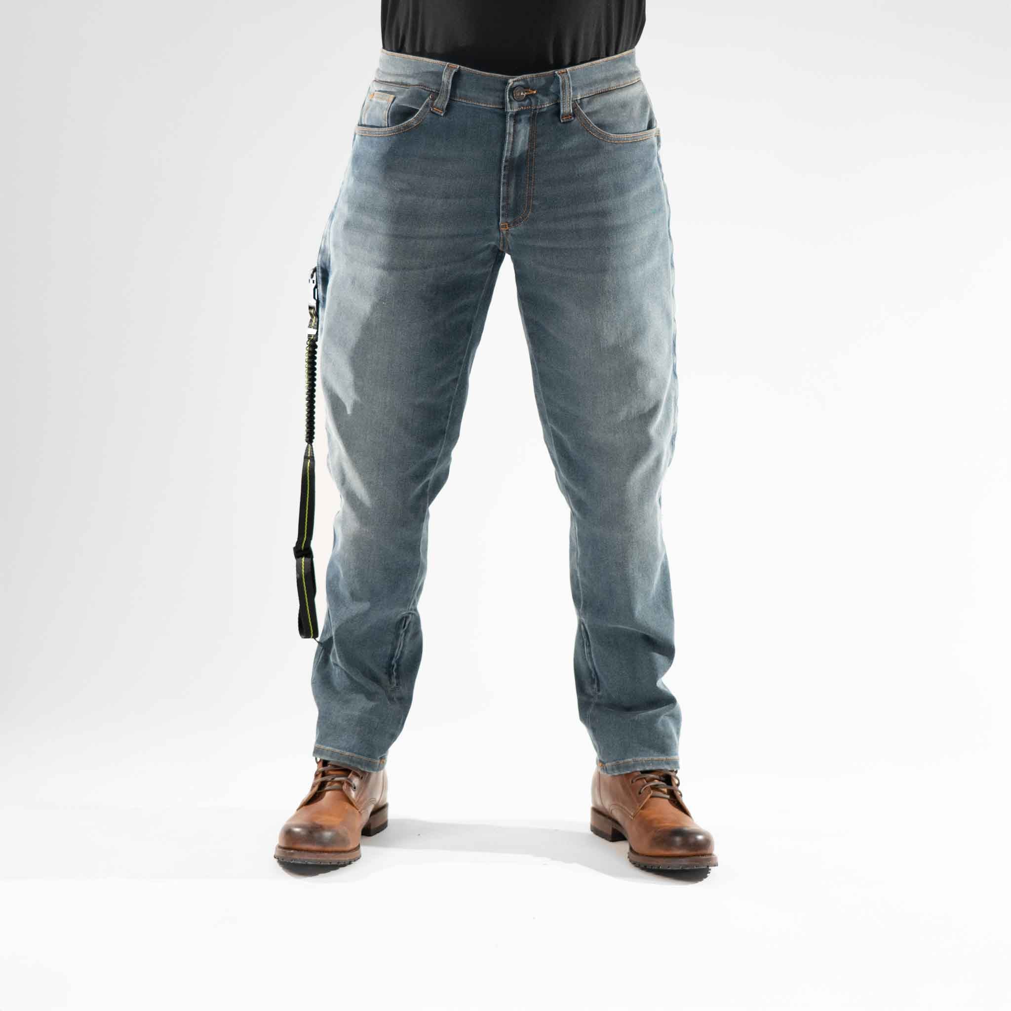 The Kian Airbag-Ready Jeans are classic blue men’s jeans designed with real-world motorcycle use in mind. Made from AAA-rated Armalith® denim, they look and feel like everyday 5-pocket jeans but are certified to one of the highest abrasion levels for motorcycle use. The denim has comfortable stretch and a straight men’s fit with room in the thighs so you can move naturally on and off the bike.