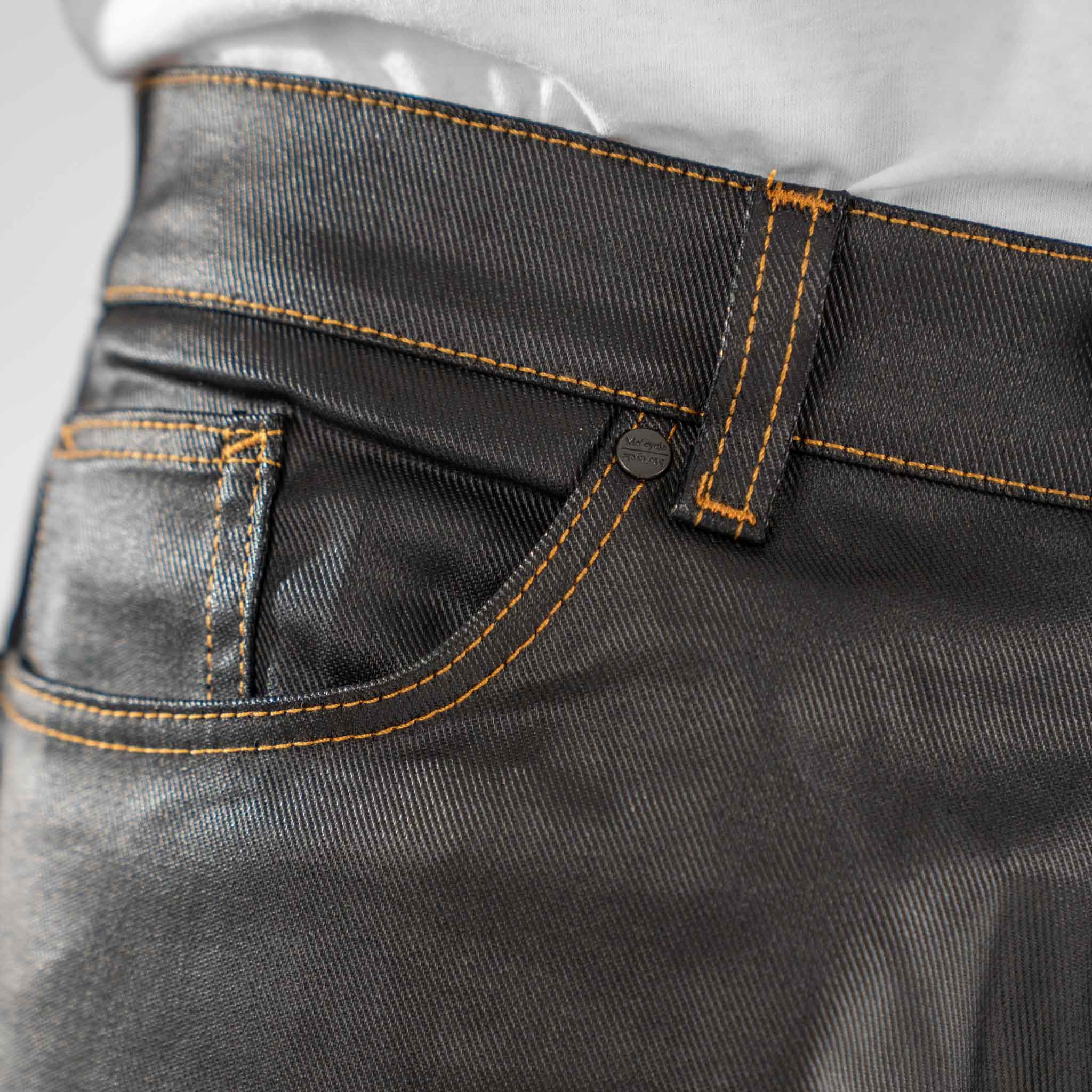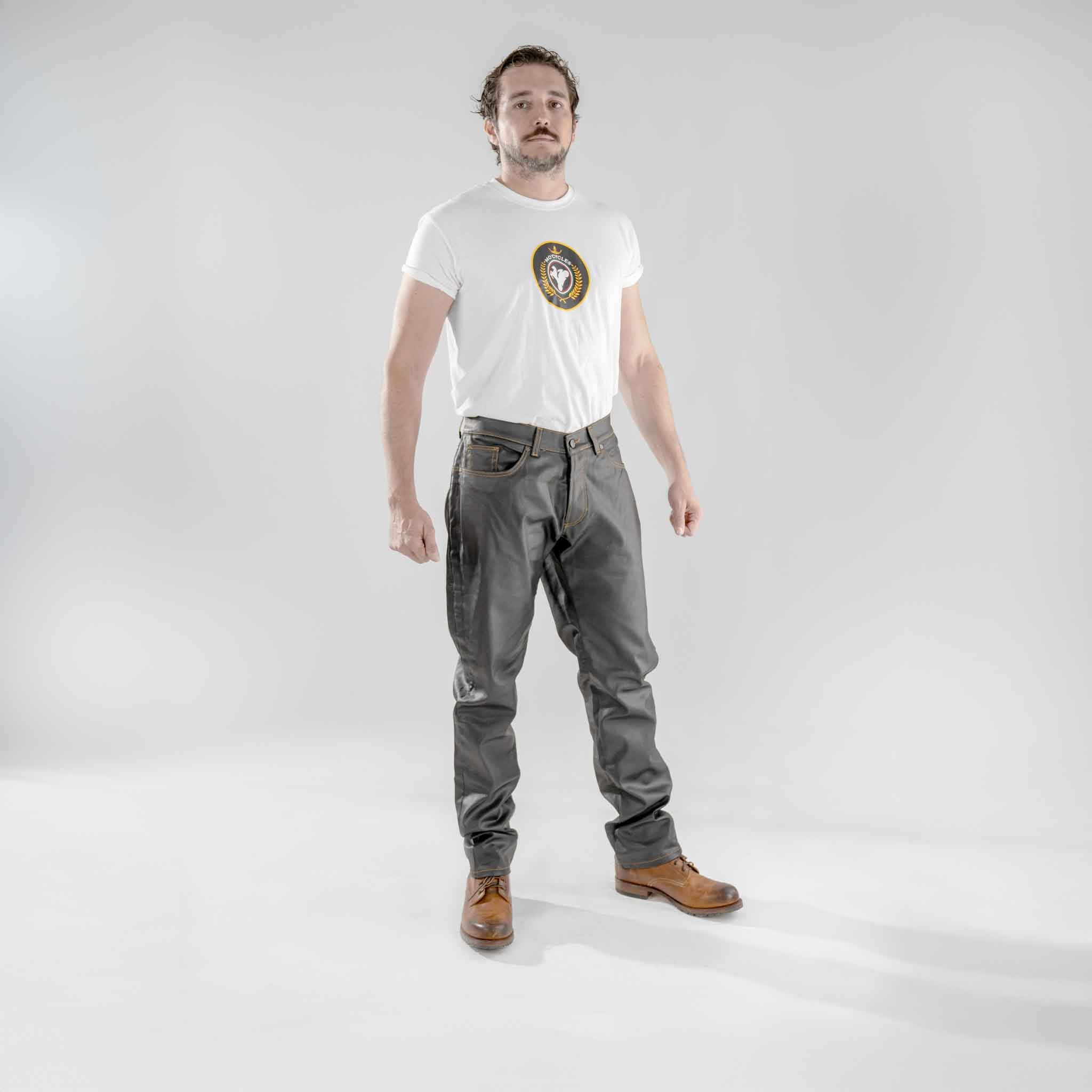Melvin is a stealth black jean built in stretchy AA-rated, black-coated Armalith® motorcycle denim with a water-repellent finish, designed to help shed light rain and road spray while delivering certified abrasion performance.