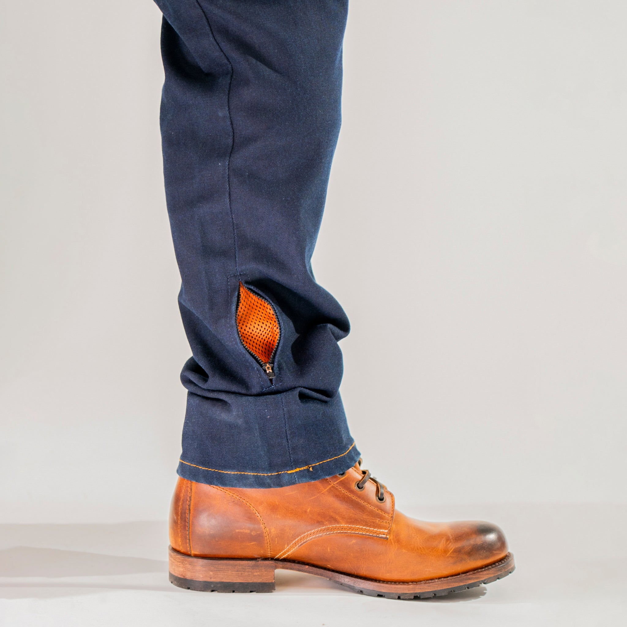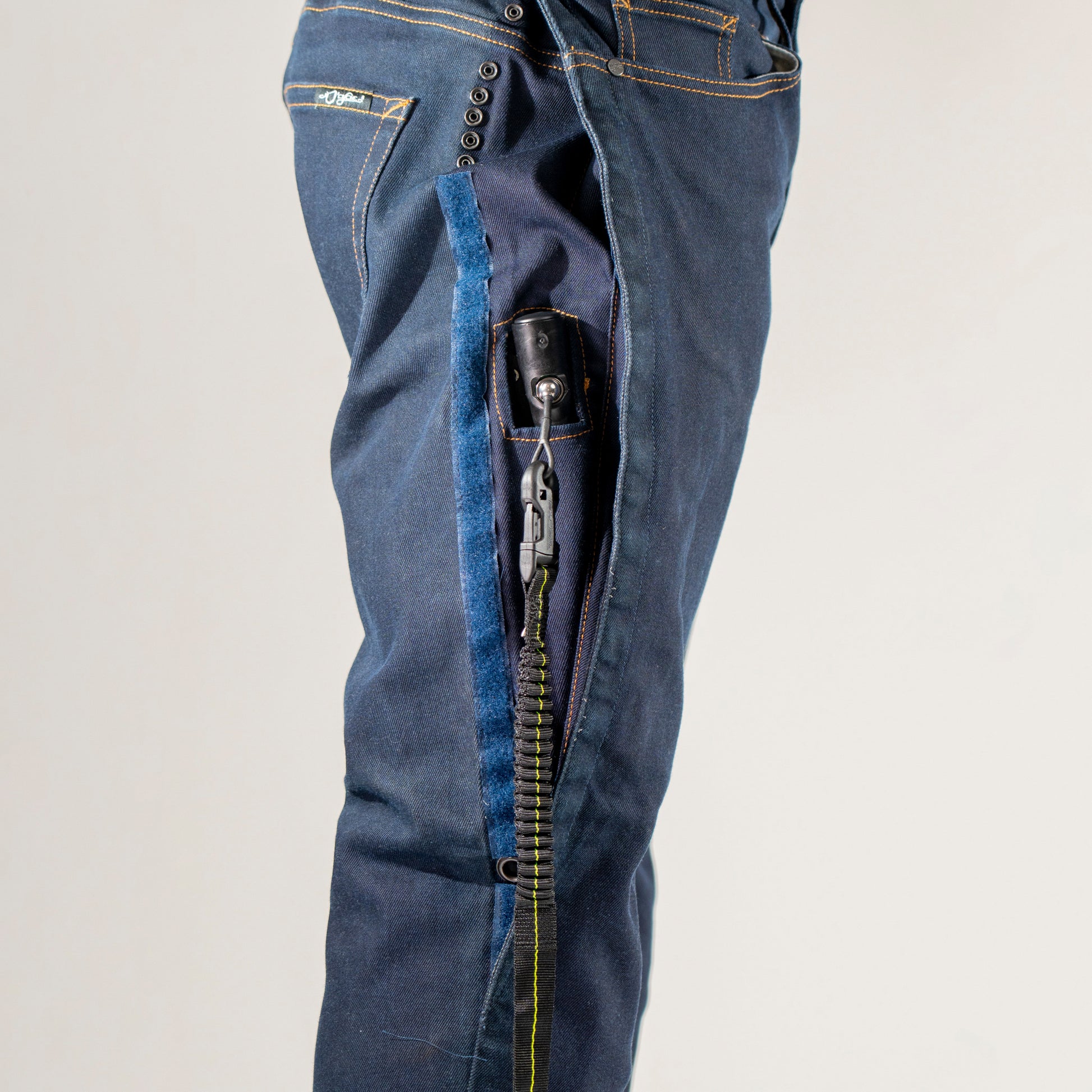The Airbag Jeans features a unique two-piece system: the jeans and the airbag are separate but can be zipped together. This design allows the jeans to slide over the airbag during an impact, reducing the force through friction and enhancing your protection.