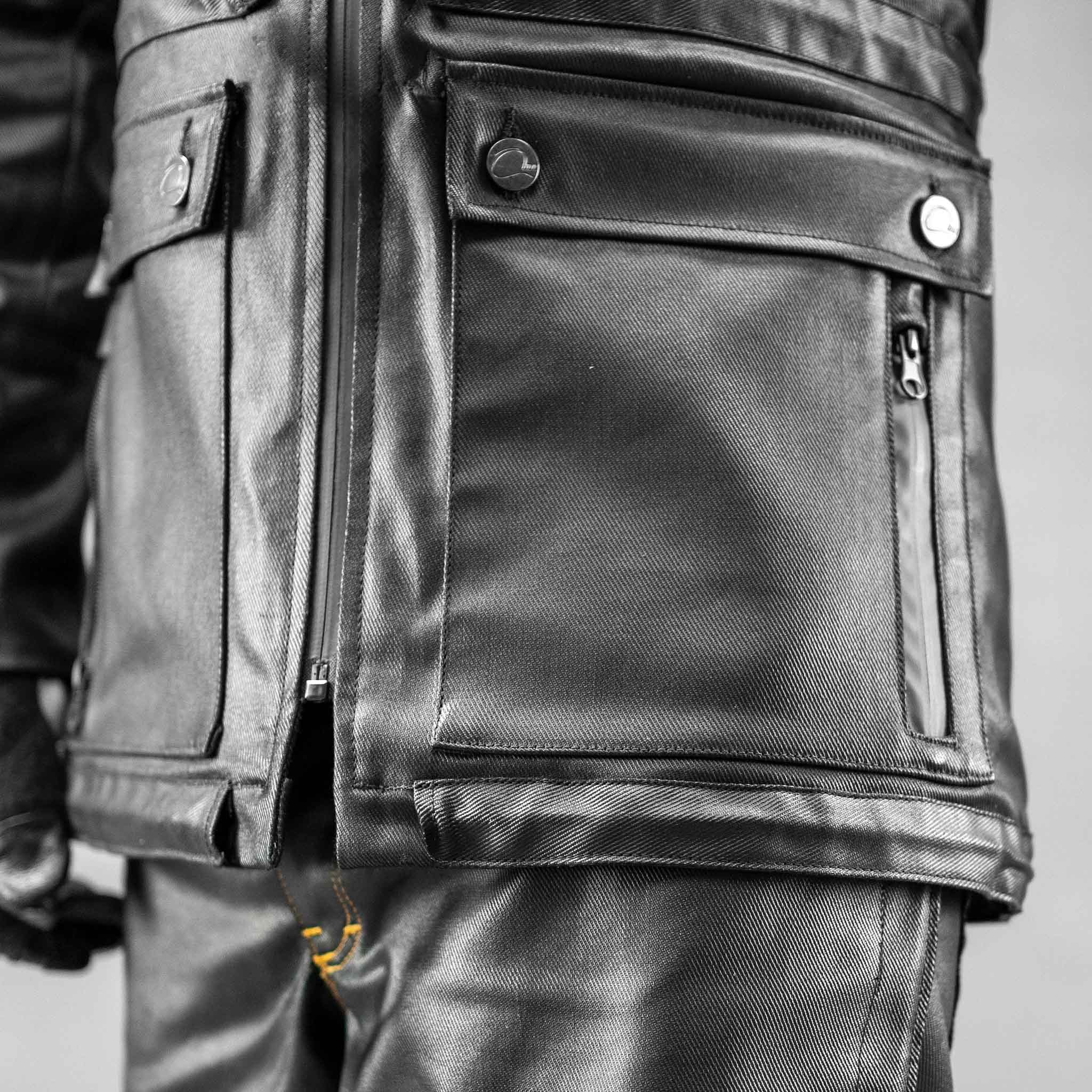 Terraine Jacket – Moto Pack provides AA-rated Armalith® abrasion performance with shoulder, elbow and back protectors positioned in dedicated pockets. Liam adds an upper-body airbag around chest, ribs, spine, collarbone and neck zone, plus its own Micro-Lock® Level 2 back pad. Melvin surrounds hips, thighs, lumbar area and tailbone with a lower-body airbag module and backs it up with Level 2 knee/shin pads and Level 1 hip pads inside AA-rated Armalith® denim.